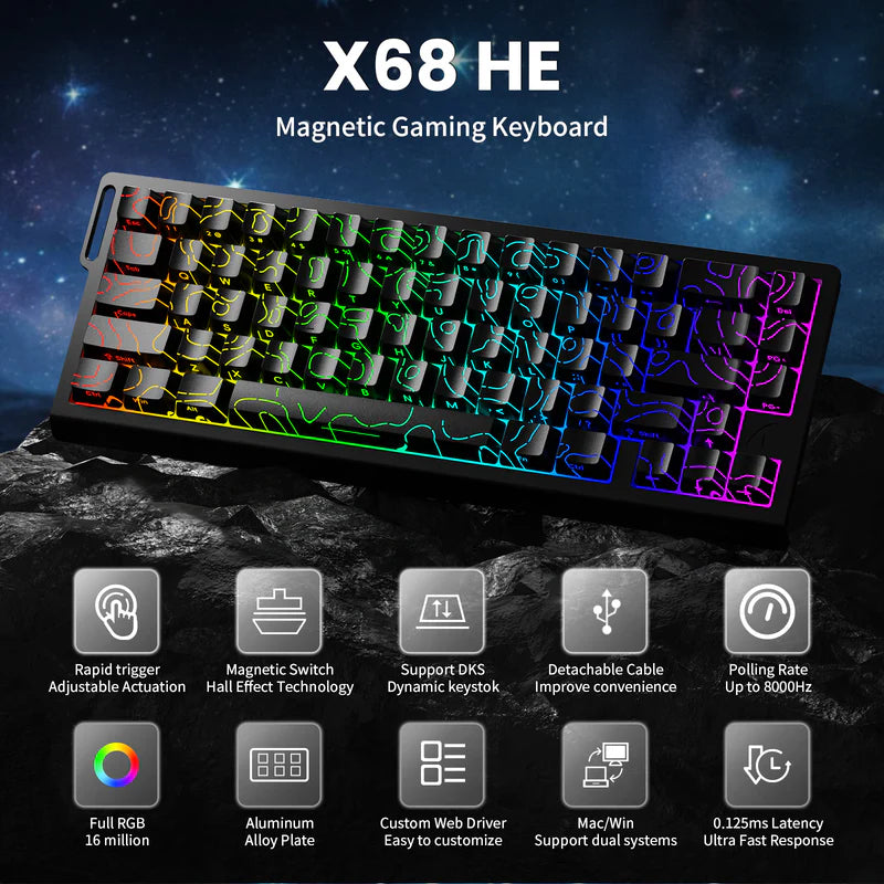 The Keyboard ATTACK SHARK X68 is a high-performance 66-key mechanical keyboard designed for precision and customization. Featuring magnetic linear switches with an actuation point adjustable from 0.1mm to 3.4mm and an exceptional 0.01mm RT accuracy, it delivers ultra-responsive keystrokes. Its 8000Hz polling rate and 128K scan rate ensure seamless input detection. The keyboard supports advanced features like Rapid Trigger, Snap Tap, Dynamic Keystrokes, Mod-Tap, and Toggle Key. Equipped with south-facing 16M RGB backlighting and durable PBT double-shot keycaps, it is hot-swappable and compatible with N-pole downward magnetic switches. Compatible with PC and Mac, it includes a keycap and switch puller plus a manual.