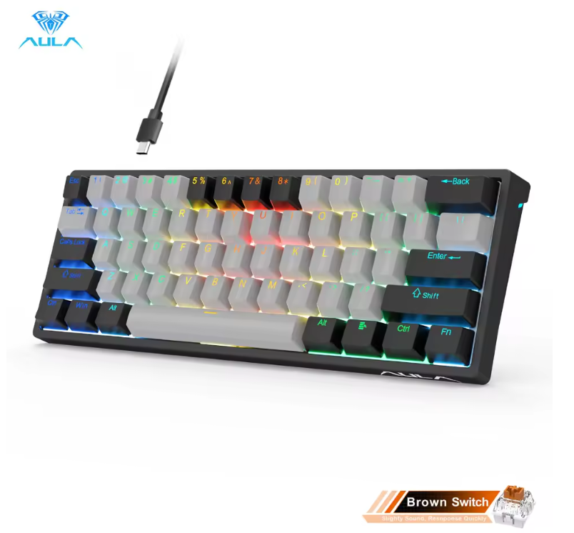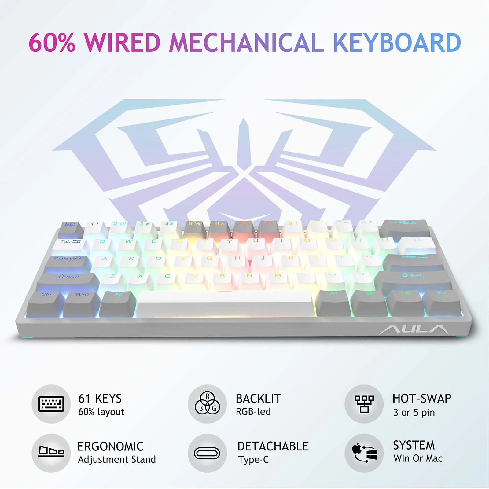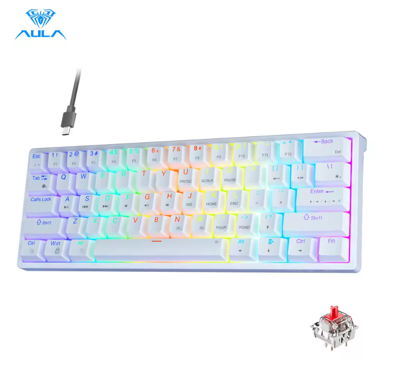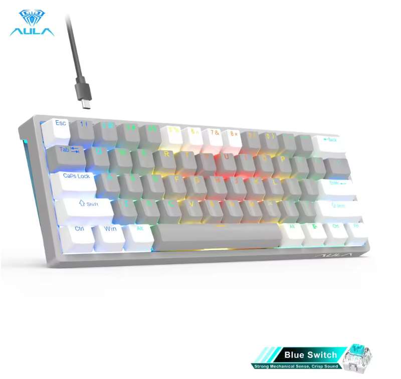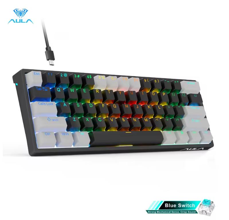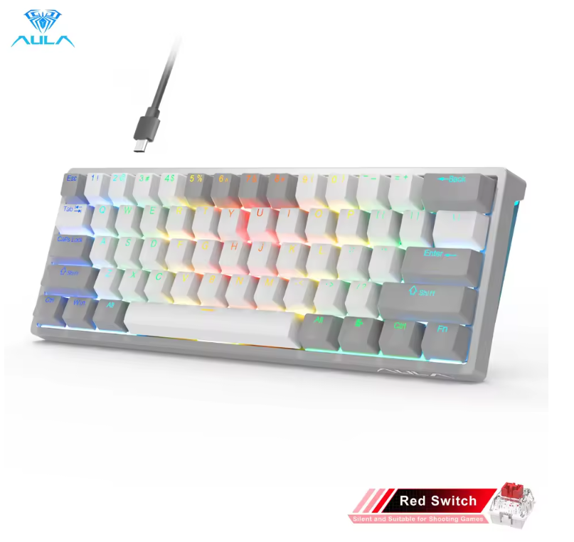 The AULA F3261 keyboard is a wired mechanical keyboard featuring 61 keys designed for efficient desktop, laptop, tablet, and numeric input. With a USB interface, it ensures reliable connectivity and compatibility across devices. Manufactured in Mainland China, this UK English layout keyboard combines compact design with precise mechanical operation, making it suitable for users seeking responsive and durable input hardware.