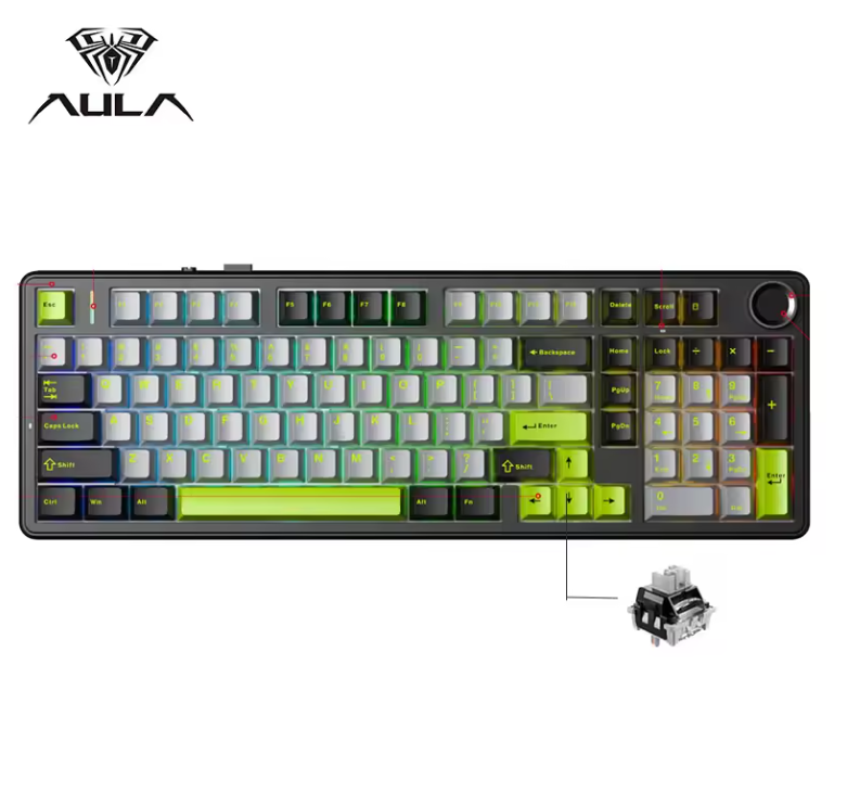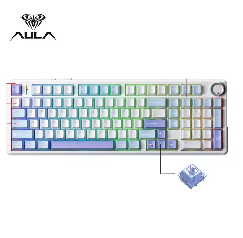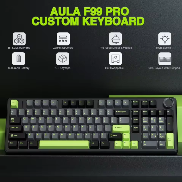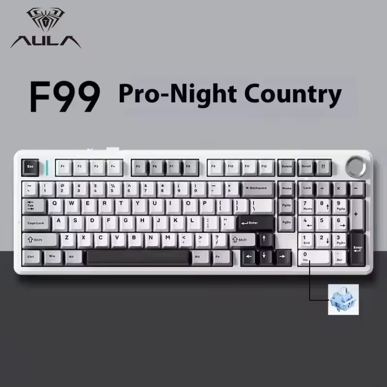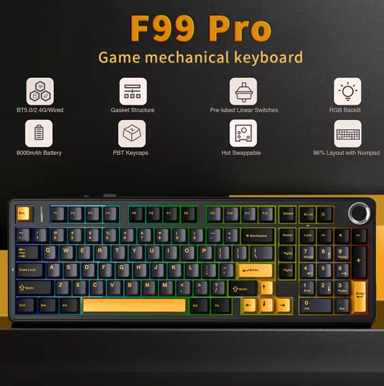The AULA F99 Pro keyboard combines advanced mechanical performance with versatile wireless connectivity via 2.4GHz, ensuring reliable use across desktops, laptops, tablets, and numeric input tasks. Featuring a durable PBT plastic keycap set and hot-swappable switches, it allows for easy customization and long-lasting durability. The keyboard supports full multicolor backlighting for enhanced visibility and style. With 98 keys arranged in a compact layout and USB interface, it balances functionality and space efficiency. Certified by CE and including a battery for wireless operation, the AULA F99 Pro is a professional-grade input device designed for demanding users.